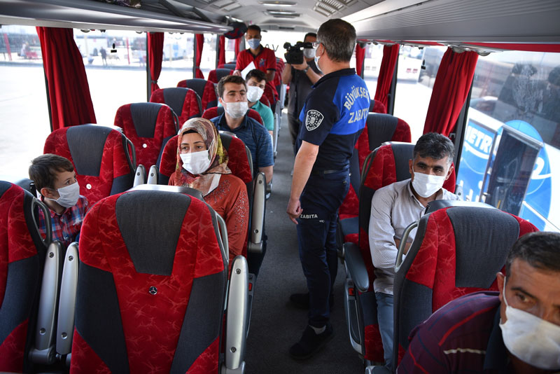 Bursa Emniyet Müdürlüğü ekipleriyle beraber toplu taşıma araçlarında ve şehirlerarası seyahat yapan otobüslerde maske ve sosyal mesafe denetimi gerçekleştiren zabıta ekipler, maskeyle seyahat etmenin önemini sürücü ve yolculara anlattı.