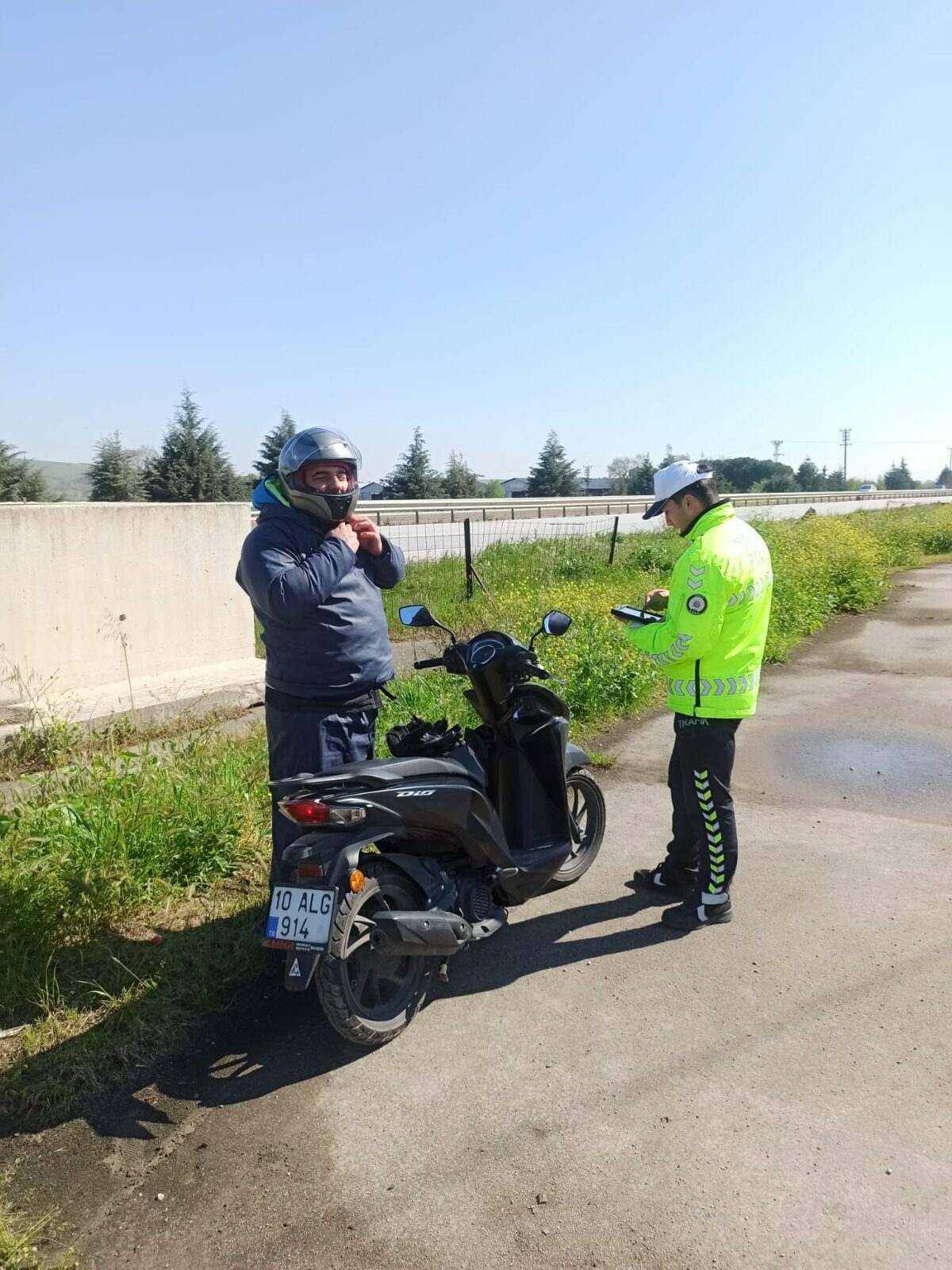 Karacabey Bölge Trafik Denetleme İstasyon Amirliği Ekipleri, Bursa-İzmir kara yolundaki denetimlerde 32 motosikletliyi durdurdu.