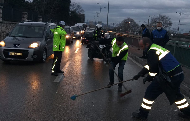 Trafik kazaları sonrası yola saçılan cam, plastik ve metal parçaları, devrilen reklam ve yön tabelaları, seyir halindeki araçların kasalarından düşen eşyalar, devrilen ağaçlar, köprü altlarında oluşan buz parçaları gibi unsurlar trafik kazalarına davetiye çıkarırken, tüm bu tehlikeler Bursa Büyükşehir Belediyesi Ani Müdahale Ekibi tarafından bertaraf ediliyor.