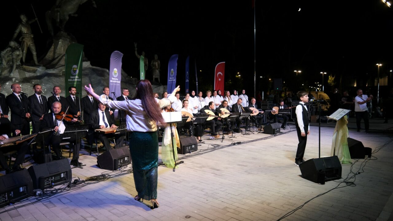 Şef Diler Yalaza yönetimindeki İnegöl Belediyesi Türk Sanat Müziği Korosu, 21.00’da heykel önünde kurulan sahnede birbirinden güzel Türk sanat müziği eserlerini seslendirildi.