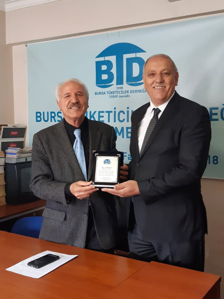 BTD Başkanı Sıtkı Yılmaz, Nilüfer Yazıişleri Müdürü ve Nilüfer İlçe Tüketici Hakem Heyeti Başkanı İbrahim Ay’a hizmetlerinden dolayı plaket takdim etti.