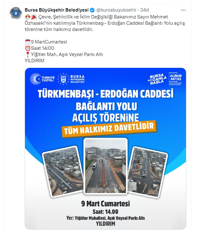 Bursa Büyükşehir Belediyesi tarafından şehrimizin ulaşımını rahatlatmak için hizmete sunulan Türkmenbaşı – Erdoğan Caddesi Bağlantı Yolu açılış töreni 9 Mart Cumartesi günü (YARIN) saat 14.00’da Çevre, Şehircilik ve iklim Değişikliği Bakanımız Sayın Mehmet Özhaseki’nin katılımıyla gerçekleştirilecektir. Tüm halkımız davetlidir.