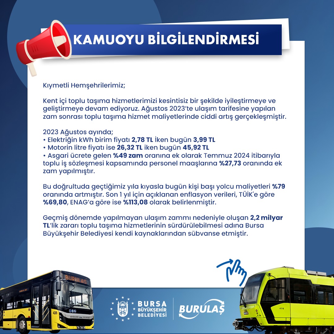 Artan maliyetlerin yükünü nispeten hafifletmek ve hizmetlerimizin devamlılığını sağlayabilmek adına, bu artışların tamamını siz değerli Bursa halkına yansıtmadan makul bir fiyat güncellemesi yapılması zaruri hale gelmiştir.