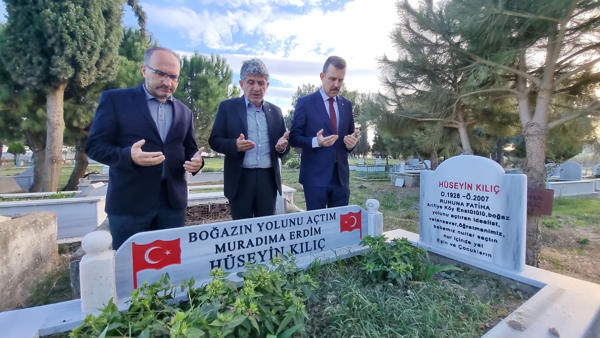 Çocuklarının mezar taşına “Boğazın yolunu açtım, muradıma erdim” yazdıkları Hüseyin Öğretmenin kabri başına gidip dua ederek andı.