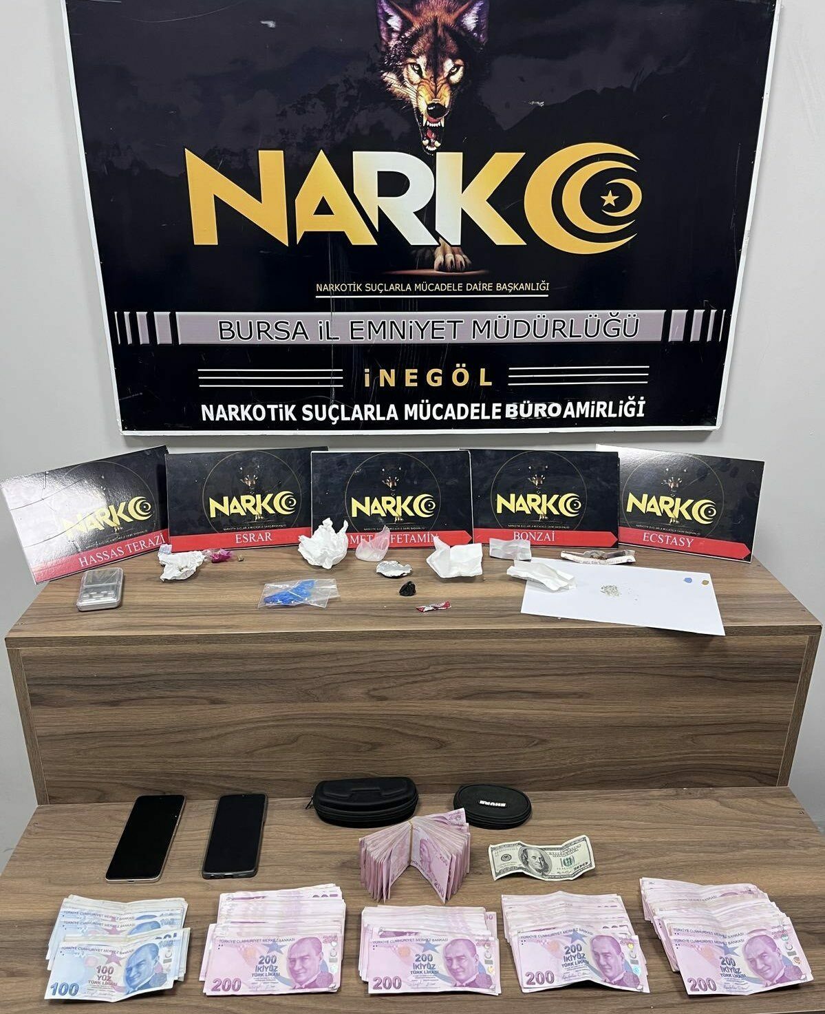 İnegöl Kaymakamı Eren Arslan, sosyal medya hesabından operasyona ilişkin açıklama yaparak, “Yapılan aramalar sonucunda 25 gram sentetik kannabinoid, 70 gram AMG maddesi, 8 parça halinde 16 gram metamfetamin, 3 parça halinde 2,60 gram esrar, 3 parça halinde 2,80 gram sentetik kannabinoid, 2 adet ectacsy hap, 1 adet hassas terazi ile 65 bin TL nakit ve 2 adet telefon ele geçirildi” dedi.