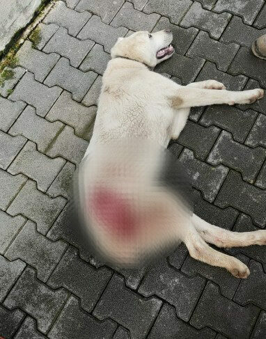 Saçmaların isabet etmesiyle yaralanan köpek, evin yakınındaki yeşil alana kaçtı.