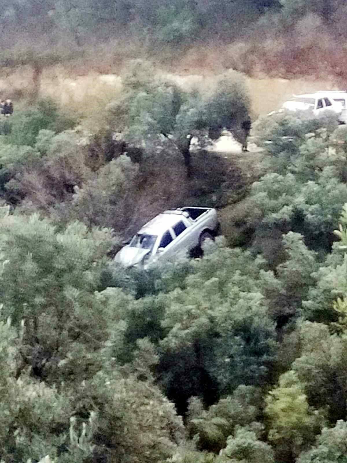 Çarpmanın etkisiyle araçlardan biri metrelerce sürüklenerek şarampolden aşağıdaki zeytinlik alana savrulurken, diğer araç son anda durabildi.