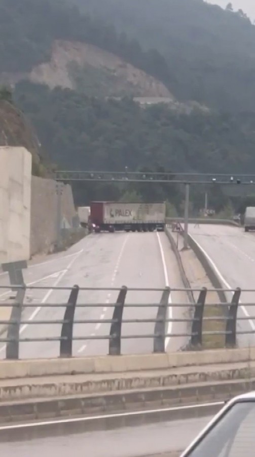 Edinilen bilgiye göre, ismi öğrenilemeyen sürücü idaresindeki 35 AJH 413 plakalı tır, kayganlaşan yolda direksiyon hakimiyetini kaybederek kaydı.