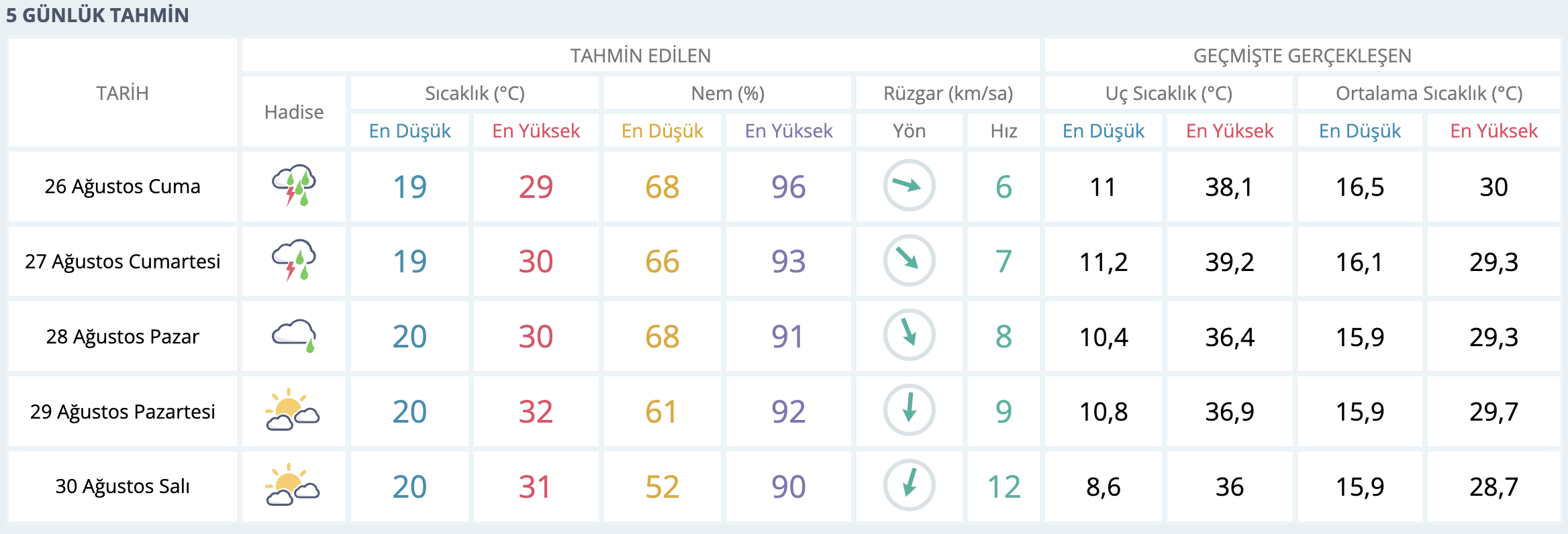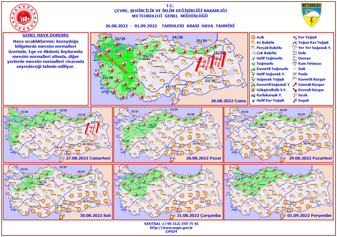 Meteoroloji Genel Müdürlüğü’nün bir haftalık hava tahminleri;