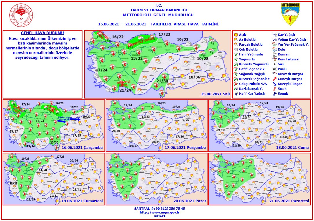 Haftalık Hava Durumu (15 – 21 Haziran 2021) Hava sıcaklıklarının Ülkemizin iç ve batı bölgelerinde mevsim normallerinin altında, doğu bölgelerde mevsim normallerinin üzerinde seyredeceği tahmin ediliyor.