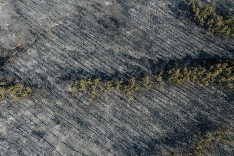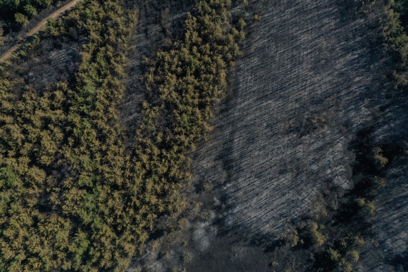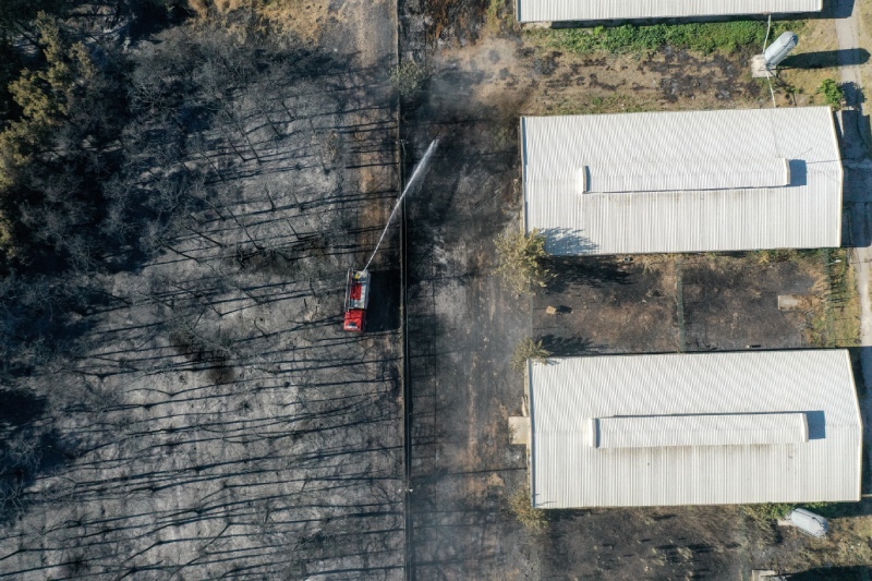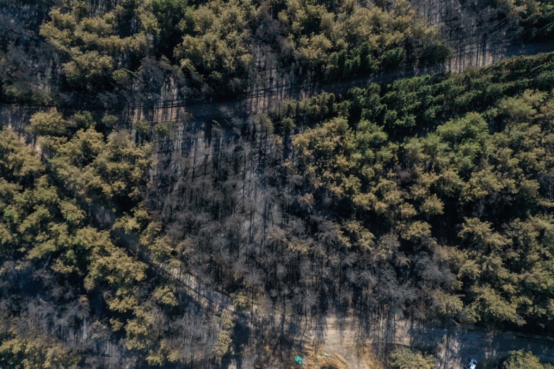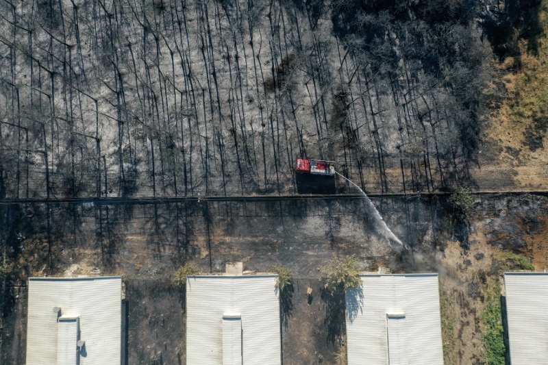 Soğutma çalışması ve hasar tespitinin sürdüğü kampüste yanan ormanlık alan, drone’la görüntülendi.