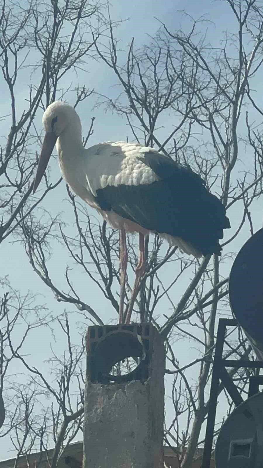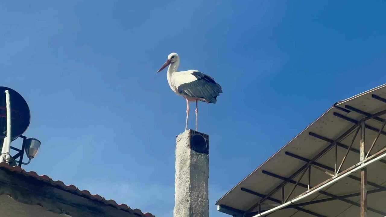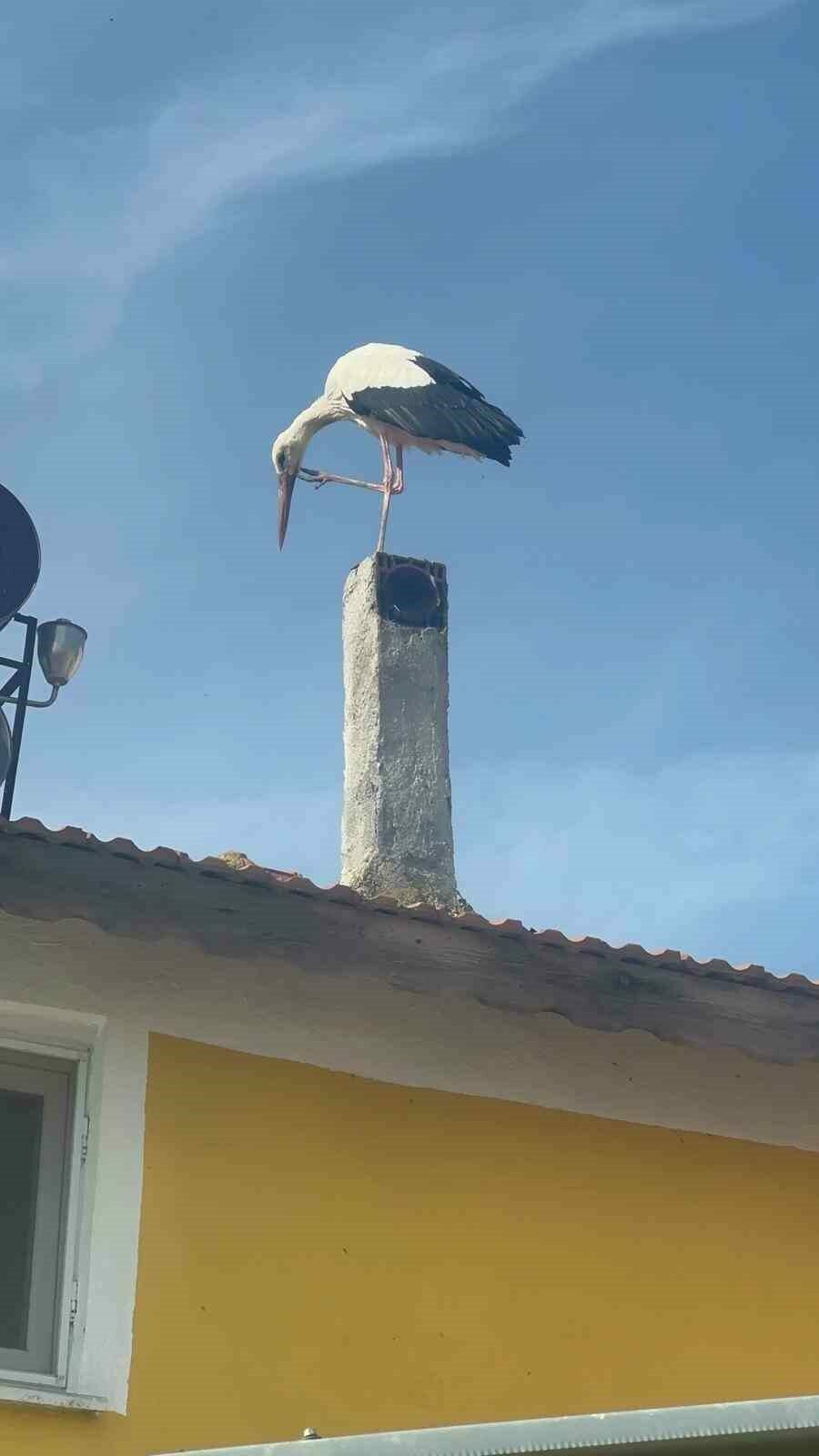 Adem Yılmaz’ın evinin bacasına ve çatısına konan leylek, Eskikaraağaç Mahallesi sakinlerini de heyecandırdı.