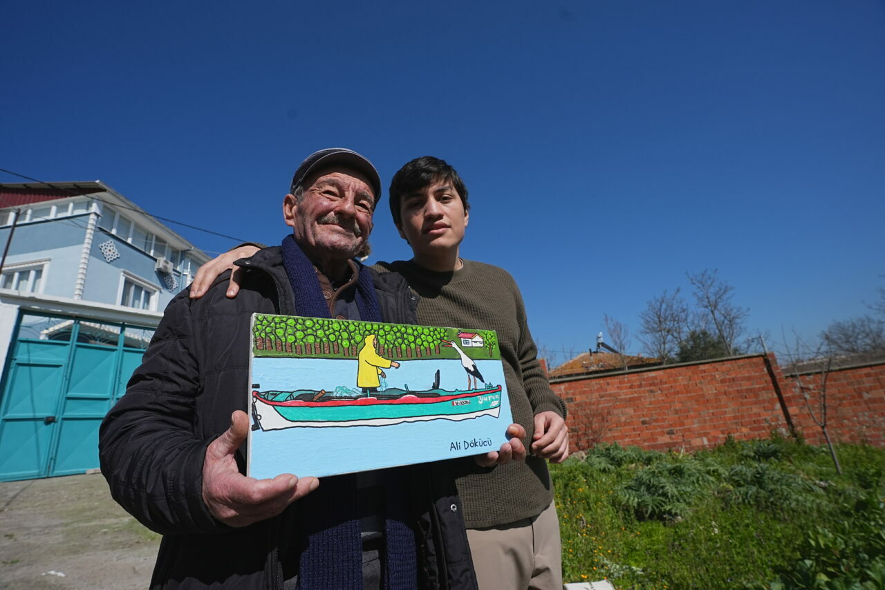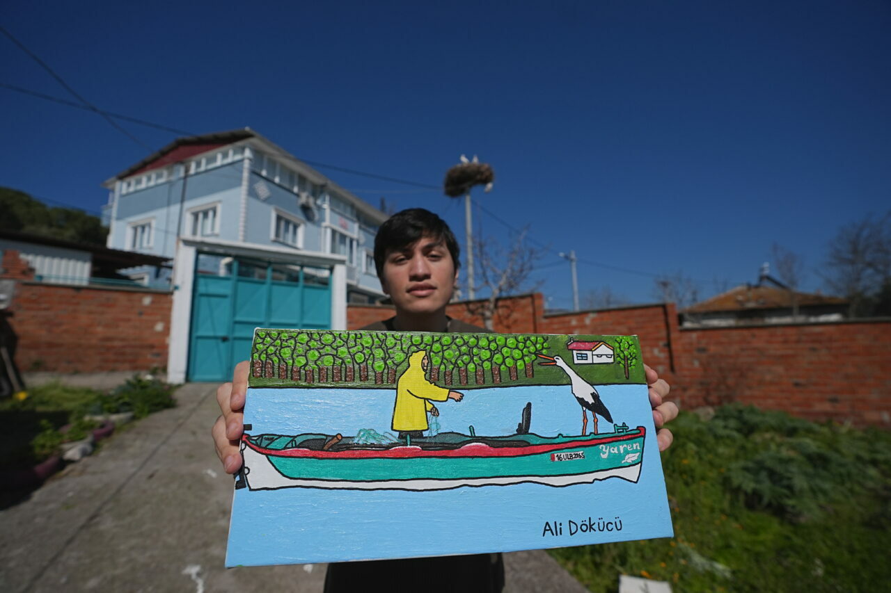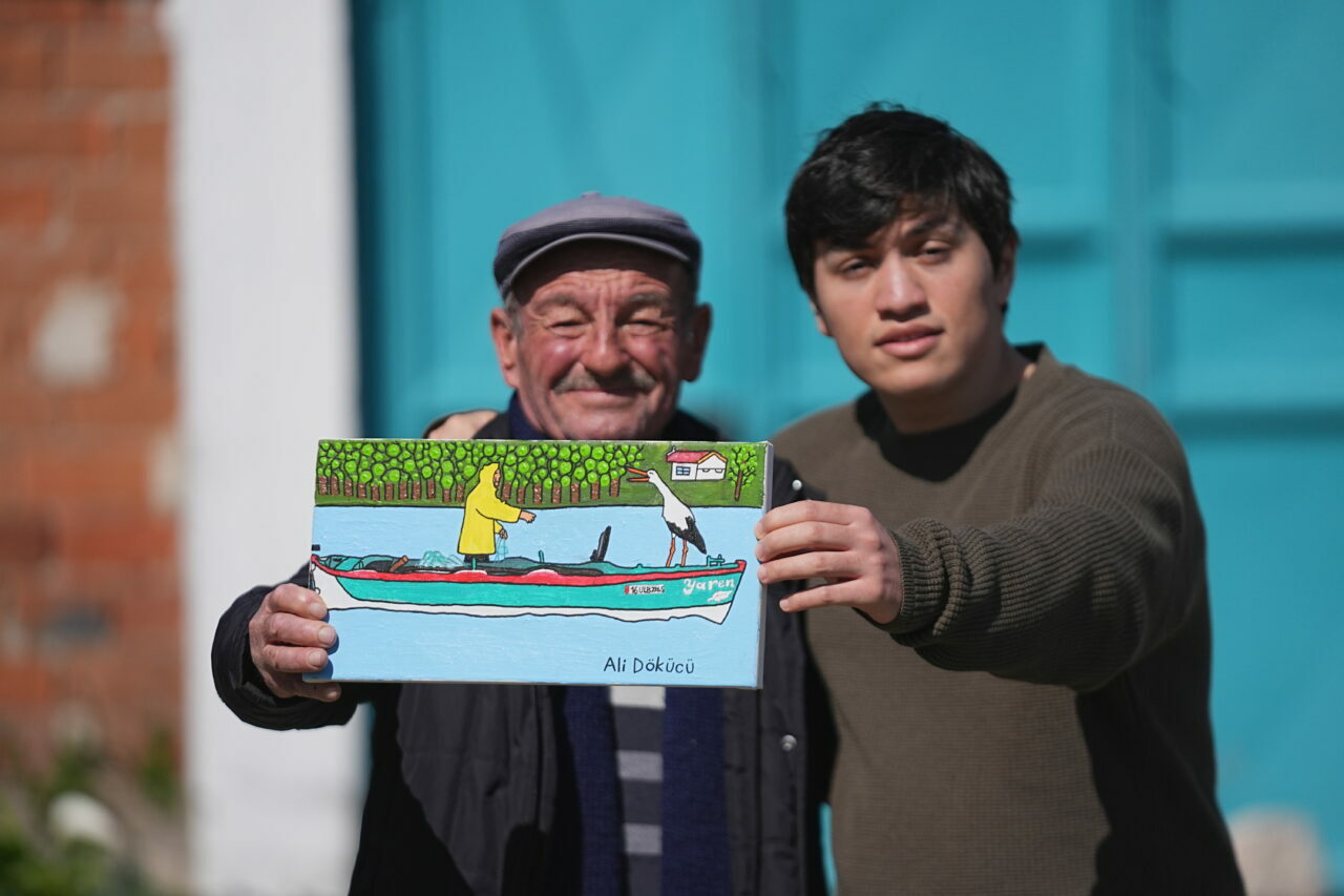 Bursa’nın Karacabey ilçesinde, Uluabat Gölü’nün kıyısındaki kırsal Eskikaraağaç Mahallesi’nin simgesi Yaren leylek ile balıkçı Adem Yılmaz’ın dostluğu otizmli genç tarafından resmedildi.