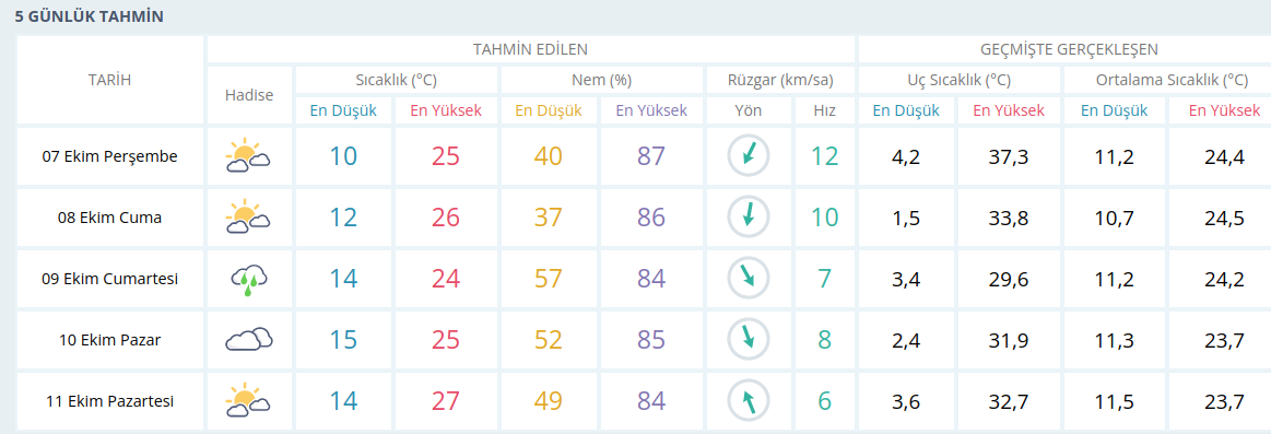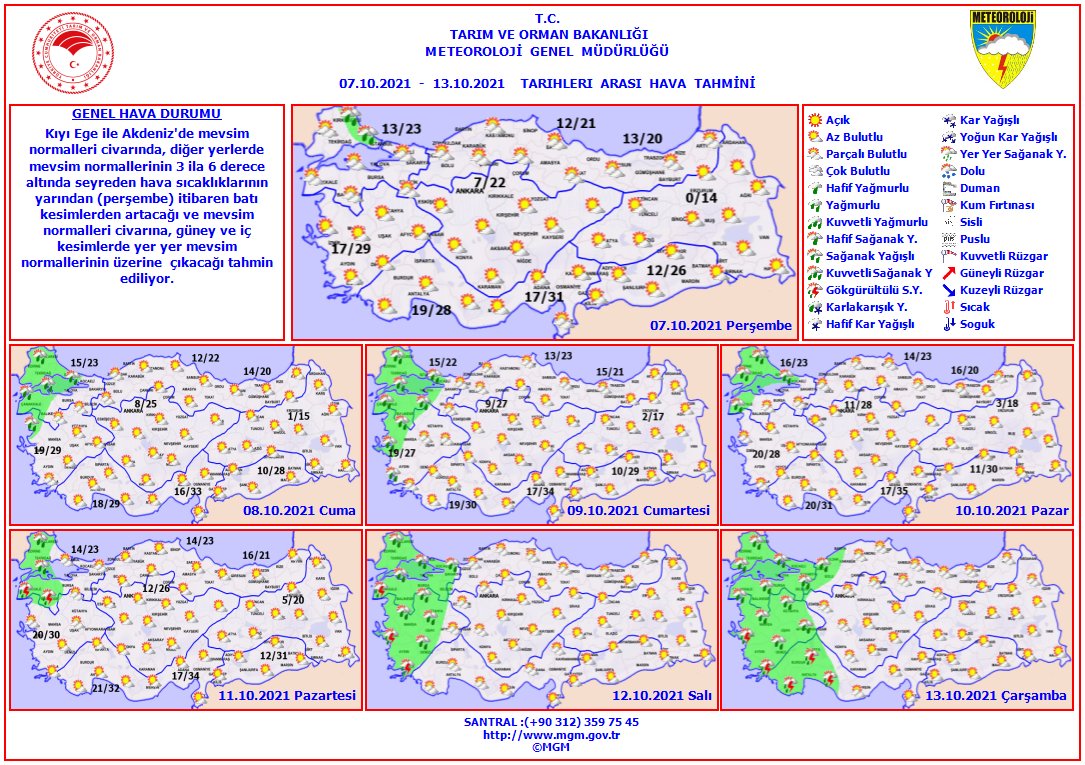 Haftalık Hava Durumu ( 7- 13 Ekim 2021) Kıyı Ege ile Akdeniz’de mevsim normalleri civarında, diğer yerlerde mevsim normallerinin 3 ila 6 derece altında seyreden hava sıcaklıklarının yarın (Perşembe) itibaren batı kesimlerde artacağı ve mevsim normalleri civarına, güney ve iç kesimlerde yer yer mevsim normalleri üzerine çıkacağı tahmin ediliyor.