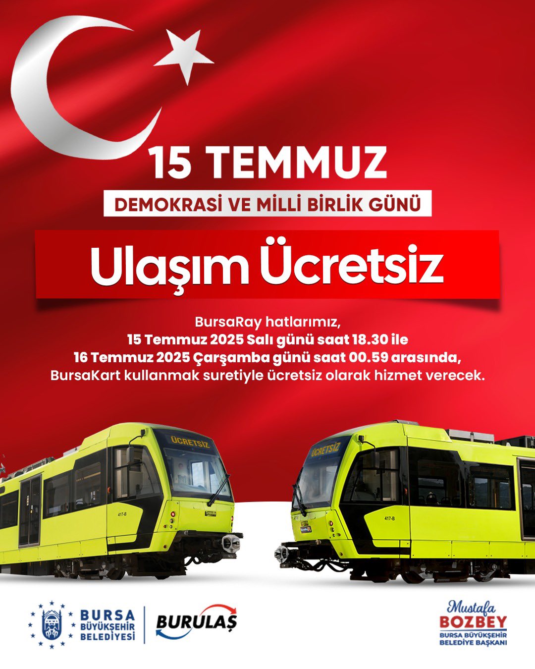 BursaRay hatlarımız, 15 Temmuz 2025 Salı günü saat 18.30 ile 16 Temmuz 2025 Çarşamba günü saat 00.59 arasında, BursaKart kullanmak suretiyle ücretsiz olarak hizmet verecek.