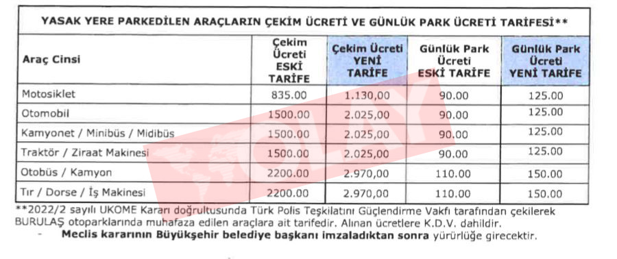 Yeni tarifeye göre motosikletlerin çekim ücreti 835 liradan 1.130 liraya, günlük park ücreti ise 90 liradan 125 liraya çıkarıldı. Otomobil, kamyonet, minibüs ve midibüslerde çekim ücreti 1.500 liradan 2.025 liraya, günlük park ücreti 90 liradan 125 liraya yükseldi. Traktör ve ziraat makineleri için de çekim ücreti 1.500 liradan 2.025 liraya, günlük park ücreti 125 lira olarak güncellendi.