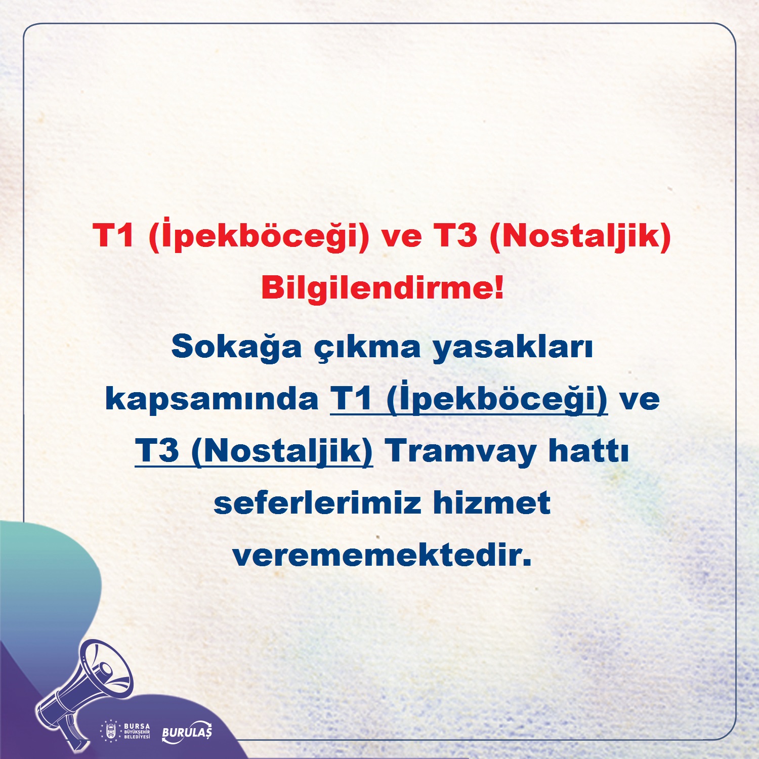 Buna göre; sokağa çıkma yasakları kapsamında T1 (İpekböceği) ve T3 (Nostaljik) tramvay hattı seferleri hizmet vermeyecek…