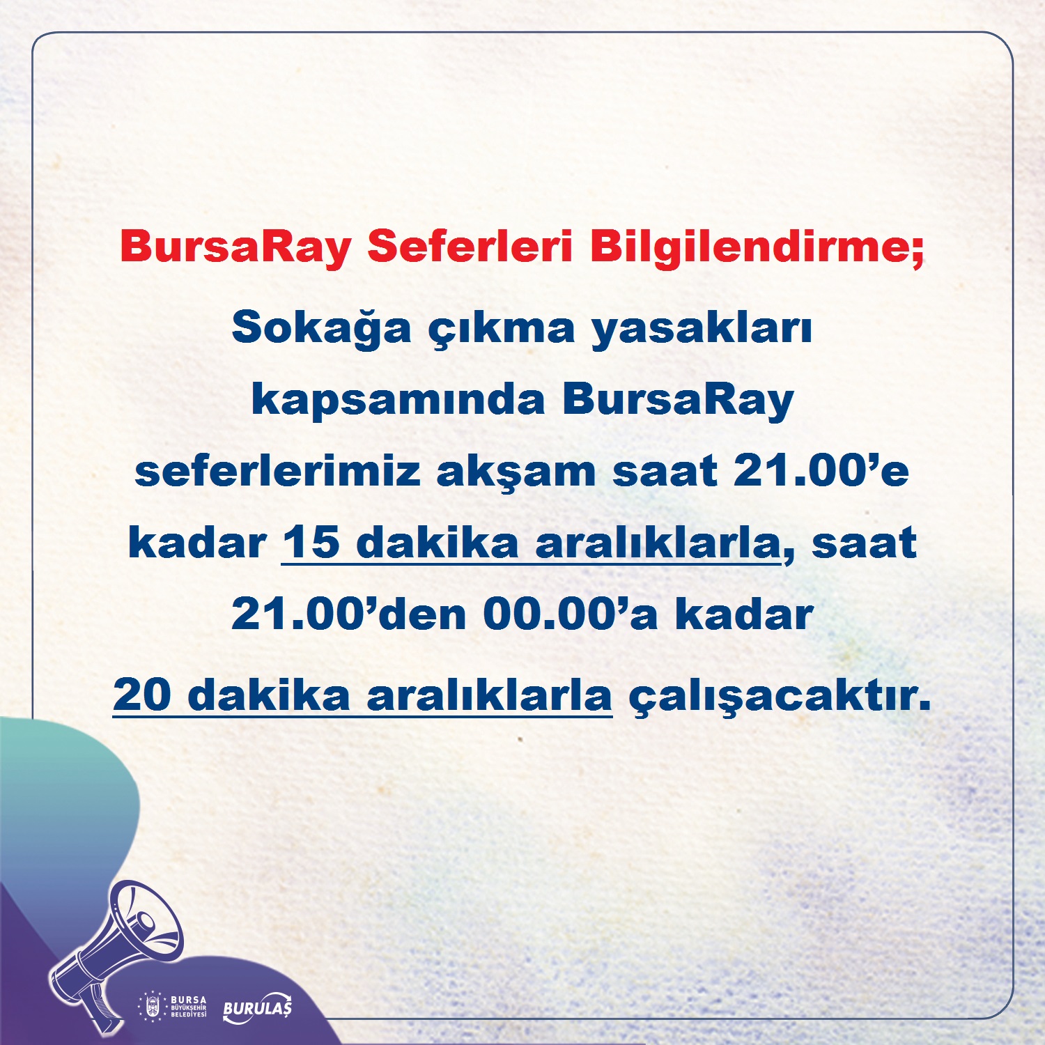 Bursaray seferleri akşam saat 21.00’e kadar 15’en dakika aralıklarla, 21.00’den 00.00’e kadar da 20 dakika aralıklarla çalışacak.