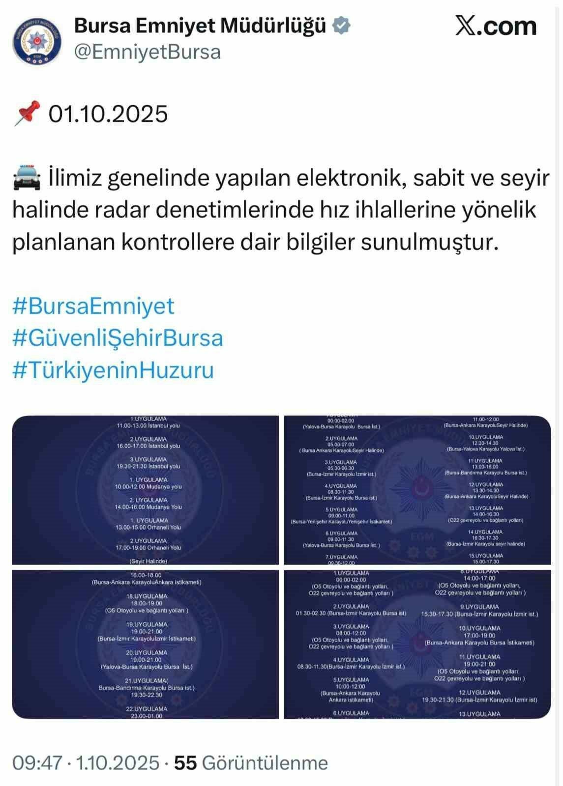 Edinilen bilgiye göre, hız ihlallerini önlemeye yönelik planlanan kontroller, sürücülere artık sosyal medya hesapları üzerinden duyuruluyor.