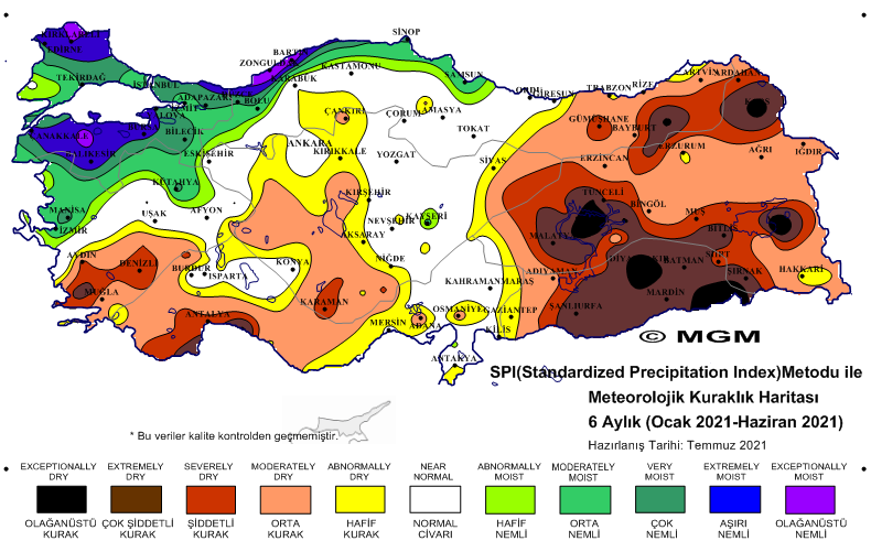 İki farklı metoda göre ölçümler yapılarak hazırlanan 2021Haziran Ayı Meteorolojik Kuraklık Durumu haritalarında SPI metodu sonuçlarına göre Doğu Karadeniz, Doğu ve Güneydoğu Anadolu bölgeleri olmak üzere ülkenin doğusu, güney Ege ve Aksaray ‘olağanüstü kurak‘ gösterildi.