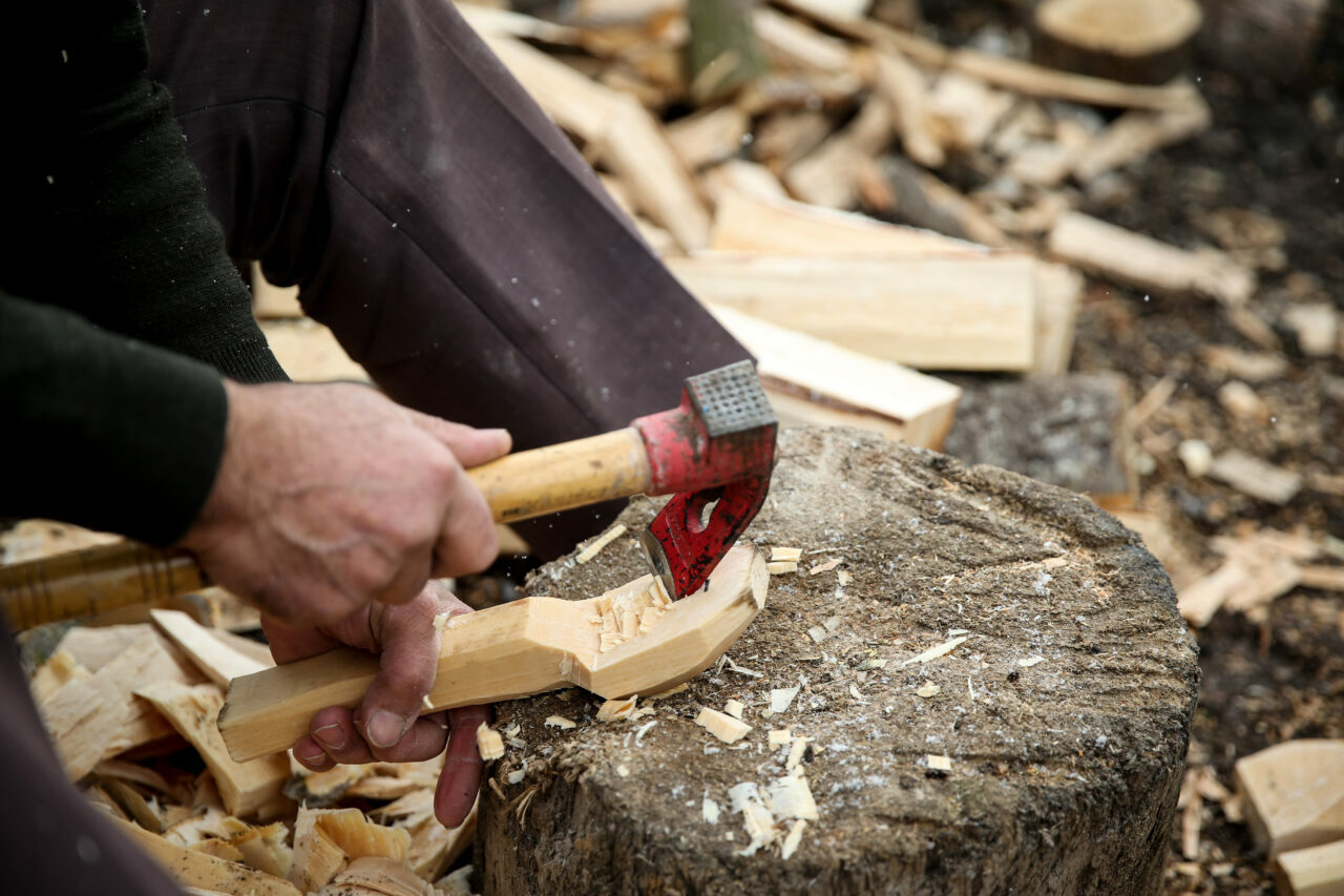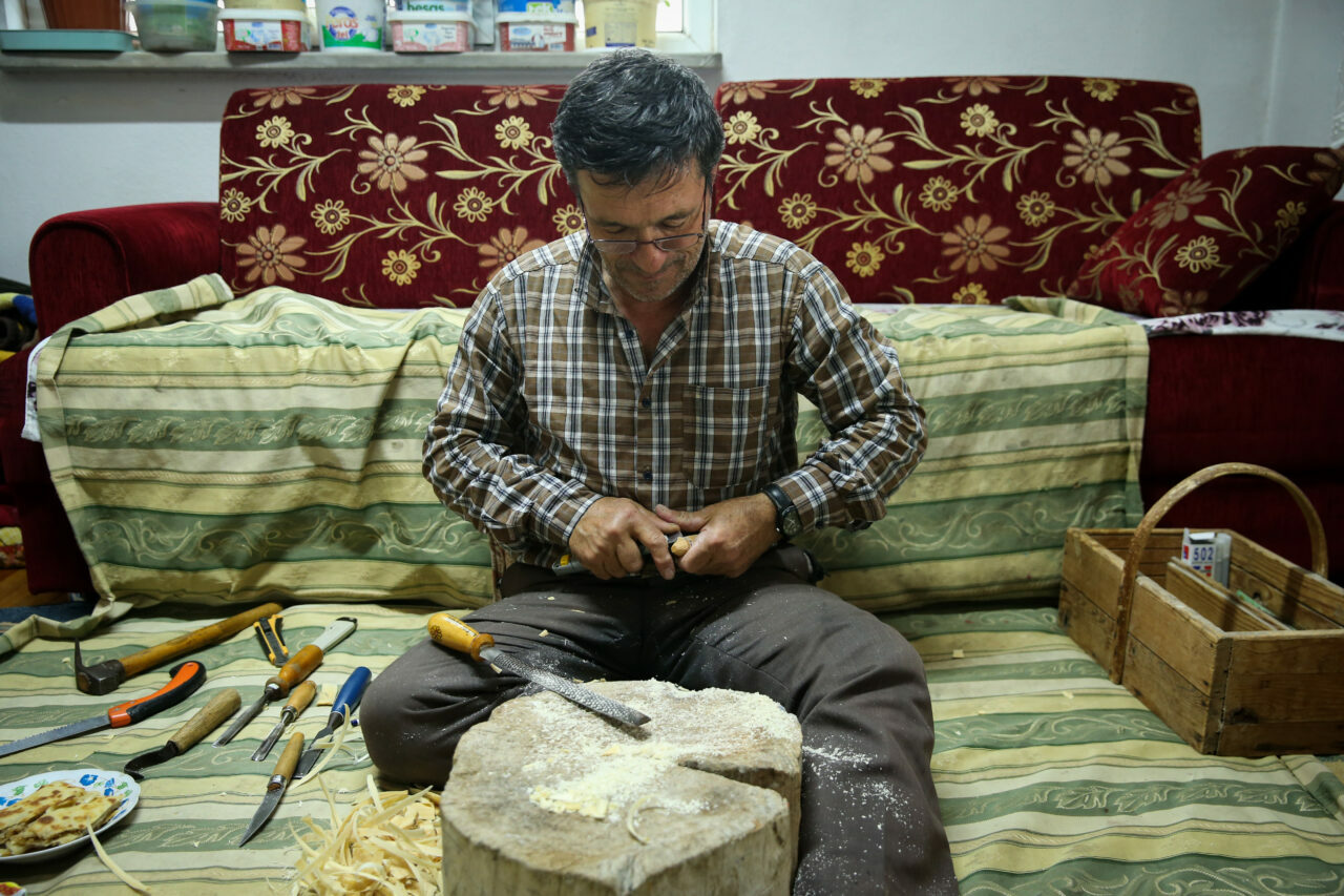 Ağaçlardan keserek elde ettiği kütüklerden önce kaşıkların taslak şekillerini ortaya koyan Uğur, keserle kaşığın sapını belirginleştirip daha sonra iç oyuntusunu yapıyor.