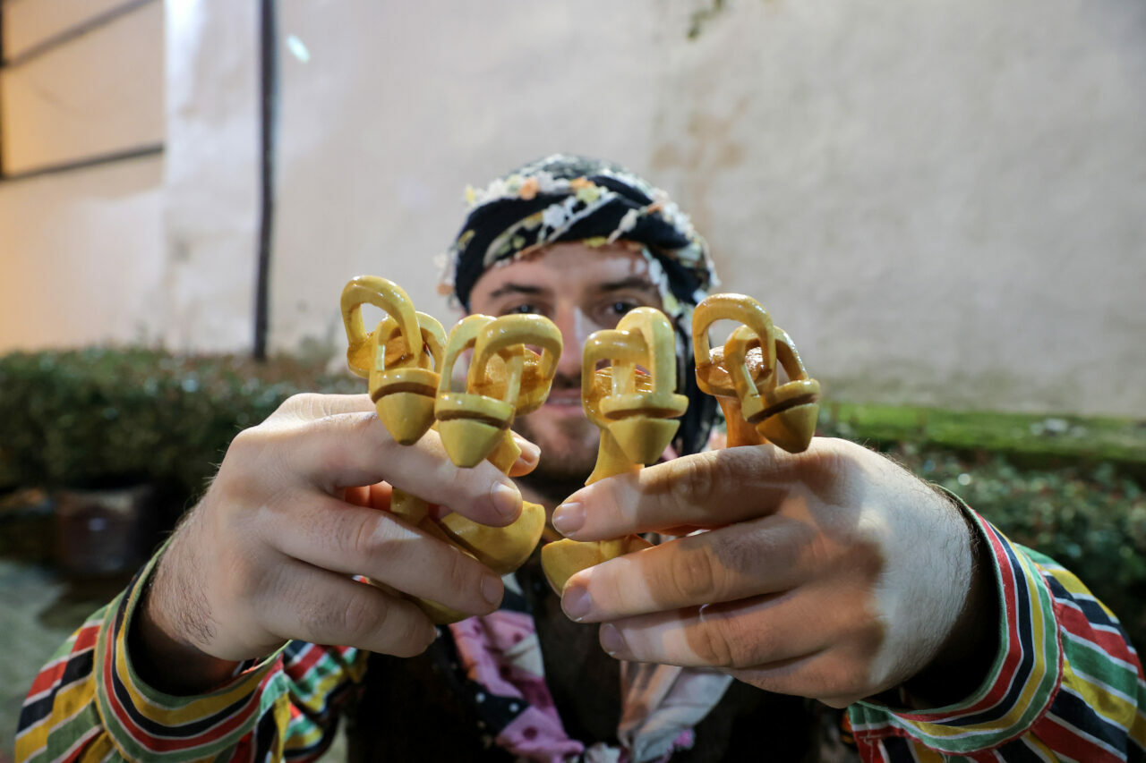 “Düğünde oyun esnasında bir kişinin elinde dört kaşıkla oynadığını gördüm. Dikkatlice bakınca kaşıkların tongurdaklı olduğunu gördüm. Çok hoşuma gitti. ‘Ben bunları yaparım.’ diye içimden geçirdim. Eve geldim, düğünden hemen iki gün sonra ağaç temin edip zor şartlarda, keser, testere, oyma aleti olmadan, oradan buradan bir şeyler bularak başladım. Mücadele ettim. İlk zamanlar üç günde bir kaşık yapabiliyordum. Kaşıkları yapmaya başladıktan sonra kardeşimin düğününe kadar 4-5 takım hazırlamıştım. Düğünde hazırladığım kaşıklarla çıkıp oynadığımızda oraya gelen herkesin çok dikkatini çekti. Bu da bizi gururlandırdı.”
