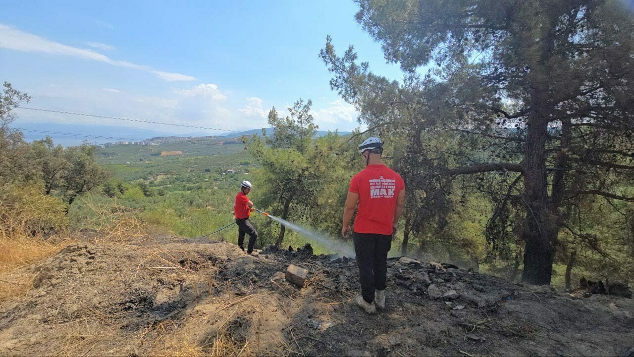 Yaklaşık 1 dönümlük ormanlık alanın zarar gördüğü bölgede, soğutma çalışmaları sürüyor.