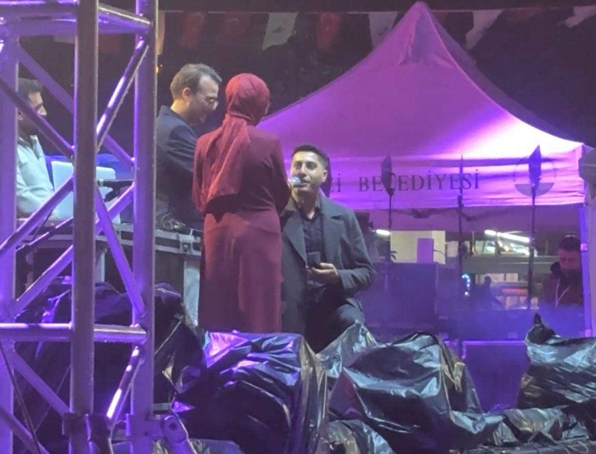 Konser hazırlıklarının sürdüğü sırada sahneye çıkan genç adam, sevdiği kişinin önünde diz çökerek “Cennet yolunda benimle yürümeye var mısın? Benimle evlenir misin?” dedi. Kalabalığın nefesini tuttuğu an, genç kadının “Evet” cevabıyla birlikte coşkuya dönüştü. Alanı büyük alkış ve tezahüratlar kapladı.