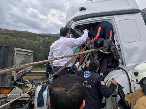 Orhangazi’den Bursa istikametine doğru giden inşaat demiri yüklü Hakan İzmir (32) idaresindeki 34 AJ 2030 plakalı TIR, önünde seyir halinde olan Harun Bayar (45) idaresindeki 13 ED 933 plakalı bir başka TIR’a çarptı.