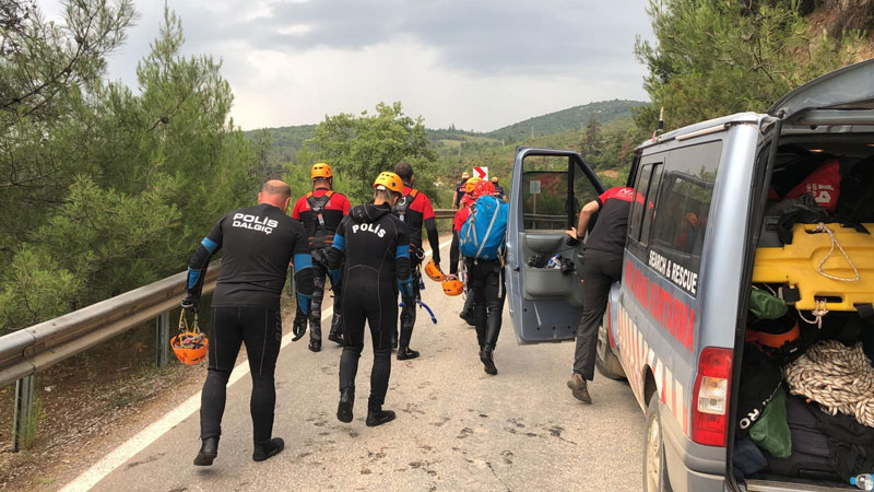 Sarp kayalıkların ve şelalelerin bulunduğu vadide İl Emniyet Müdürlüğüne bağlı dalgıç polisler ve arama kurtarma ekipleri arama çalışması yaparken bir grup arama kurtarma ekibi de dere kenarında bulunan toprak alanı tarıyordu.