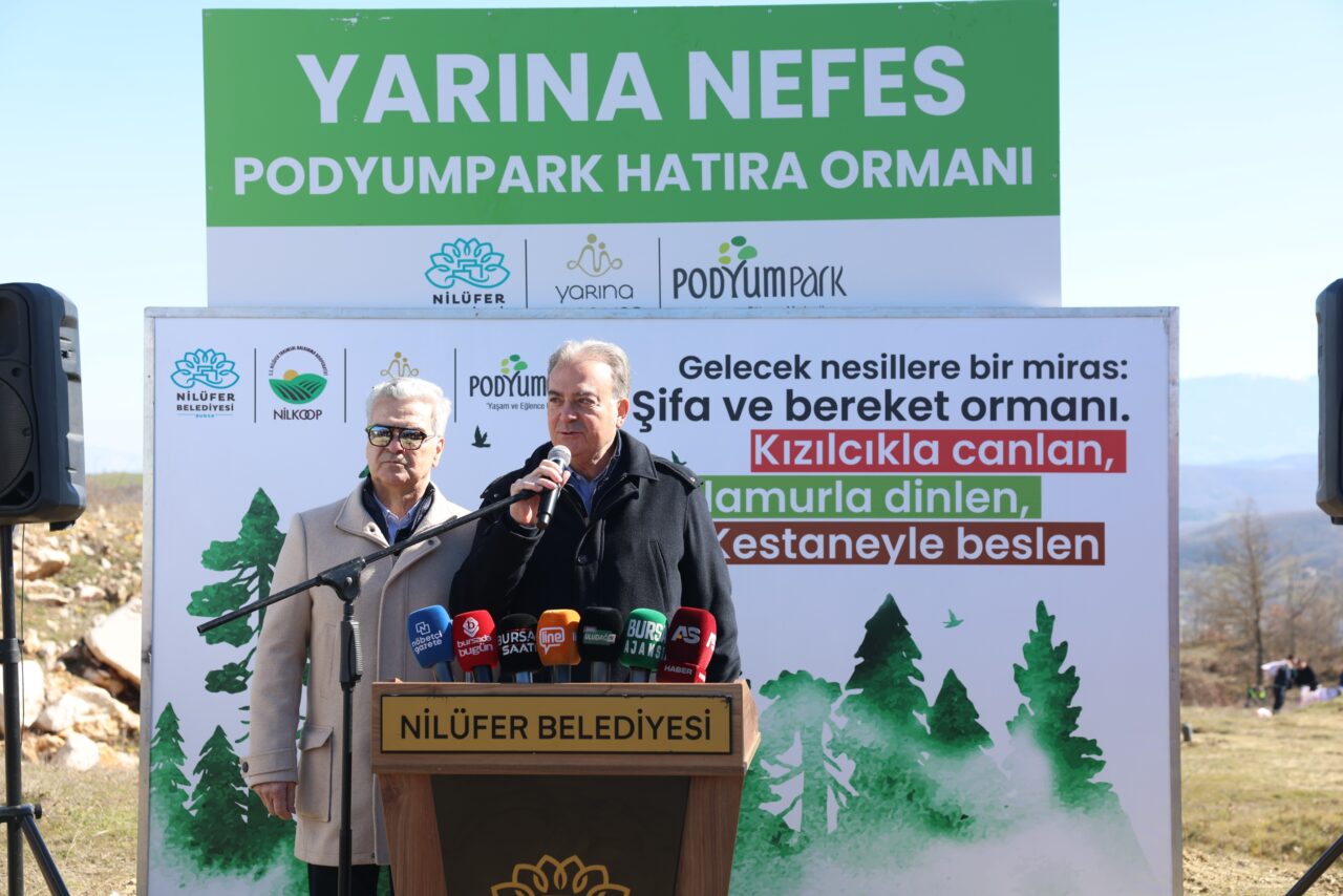 Nilüfer Belediye Başkanı Şadi Özdemir burada yaptığı konuşmada, toprağa, doğaya ve geleceğe sahip çıktıklarını söyledi. Özellikle kırsal bölgelerde yeniden sürdürülebilir bir yaşam için NİLKOOP ile birlikte çalışma yürüttüklerini dile getiren Başkan Şadi Özdemir, “Vatandaşlarımıza toprak analizleri, mühendis desteği, satın alma güvencesi gibi birçok destek veriyoruz ki bu toprakları koruyabilelim. Belki 100 yıl sonra da bu topraklardan üretilen ürünlerle çocuklarımız, torunlarımız karınlarını doyurabilsin istiyoruz” dedi. Belediyeye ait arazilerin boş durmaması için ekip biçtiklerini anlatan Başkan Şadi Özdemir, “Ancak bazı alanlarımız ekime uygun değil. Eğimi yüksek, işlemesi zor olan arazilerimiz vardı. Biz dedik ki; Nilüfer’de hiçbir toprak parçası boş kalmamalı. O arazileri yeniden üretime kazandırmalıyız. Güngören Mahallesi’ndeki 32 dekar alanımız da bunlardan birisi. Biz de sivil toplum ile güçlerimizi birleştirdik. Yarına Şans Ver Derneği ve Podyumpark desteğiyle ‘Yarına Nefes Podyumpark Hatıra Ormanı’nı hayata geçiriyoruz” dedi.