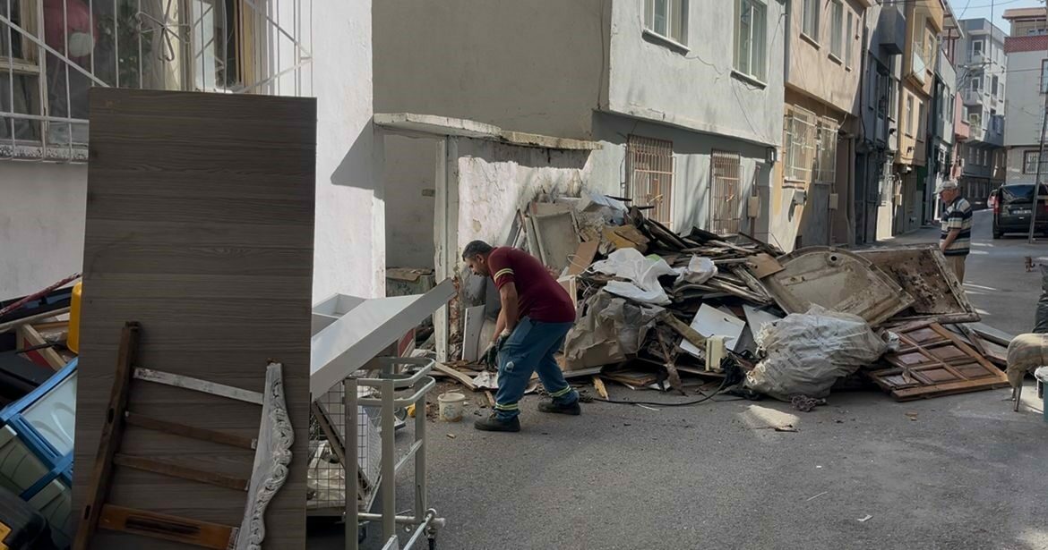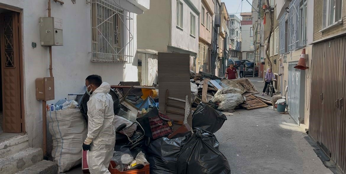 Uzun süredir çevreye rahatsızlık veren kokuların kaynağı olduğu öğrenilen evde Yıldırım Belediyesi ekiplerince yapılan temizlik çalışmasında, kapıdan adım atacak yer kalmayacak şekilde yığılmış çöpler olduğu görüldü.