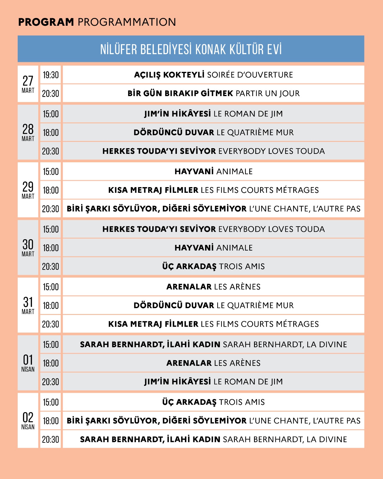 Nilüfer Belediyesi Konak Kültürevi’nin ev sahipliği yapacağı festival, 27 Mart günü açılış kokteyli ile başlayacak. Açılış filmi, aynı zamanda geçen yıl Cannes Film Festivali’nin açılış filmi olan “Bir Gün Bırakıp Gitmek” olacak. Gösterim kokteyl sonrası gerçekleşecek.