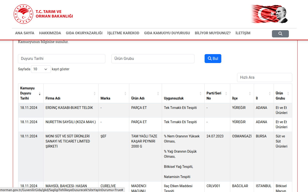 Yine 7 Kasım’da kamuoyuna yapılan duyuruda da, ‘Tereyağı 1000 G’ ürününde de ‘% Yağ Oranının Düşük Olması, Süt Yağı Harici Yağ Tespiti” yapıldığı gözlendi…