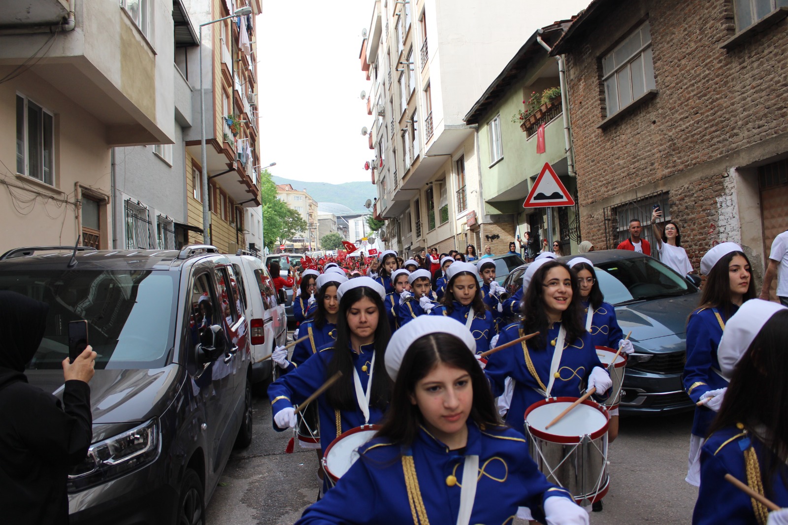 Coşkulu bir kutlama töreni başlangıcında bando takımı ve öğrenciler mahallede yürüyüş düzenledi.
