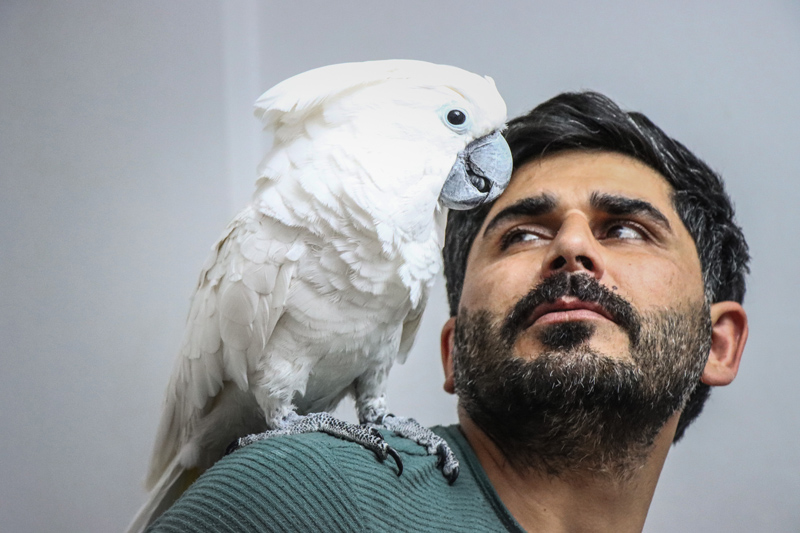 Rahim Çakmak ve ailesinin “umbrella kakadu” cinsi papağanı, müzik çalınması ve komut verilmesiyle başını, vücudunu farklı yönlere sallayarak ilginç hareketler sergiliyor.