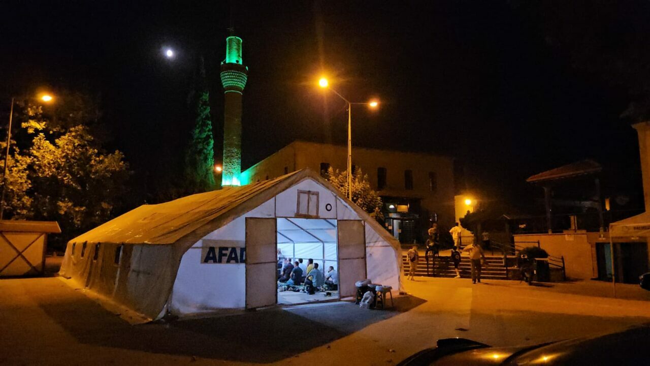 Sındırgı ilçesindeki vatandaşlar da 10 Ağustos’ta meydana gelen 6,1 büyüklüğündeki depremde hasar gören ve şu anda kullanılmayan tarihi Şerif Paşa Camisi’nin bahçesine AFAD tarafından kurulan çadırda namaz kıldı, Mevlit Kandili’ni idrak etti.