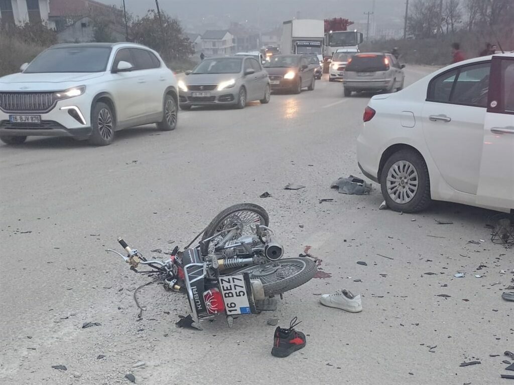 Yokuş aşağı inen Muhammed Şiğva yönetimindeki 16 BEZ 577 plakalı motosiklet ile karşı yönden gelen ve ara sokağa dönmek isteyen Uğur D. (38) yönetimindeki 16 BUY 603 plakalı otomobil çarpıştı. Şiğva ile arkasındaki Recep Koray S. (14) yaralandı. İhbar üzerine bölgeye polis ve sağlık ekipleri sevk edildi.