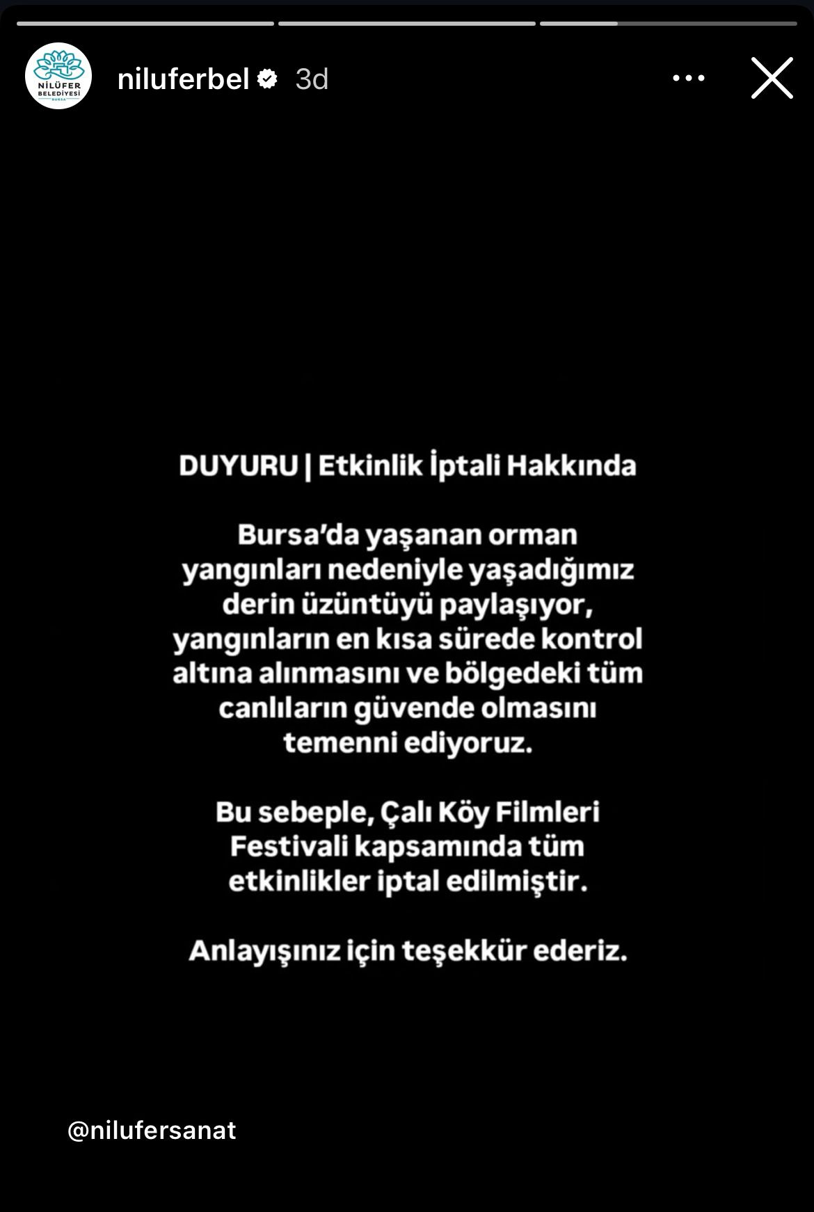 Nilüfer Belediyesi, 9. Çalı Köy Filmleri Festivali’nin Kestel, Gürsu, Harmancık ilçelerinde meydana gelen ve devam eden orman yangınları nedeniyle iptal edildiğini duyurdu.