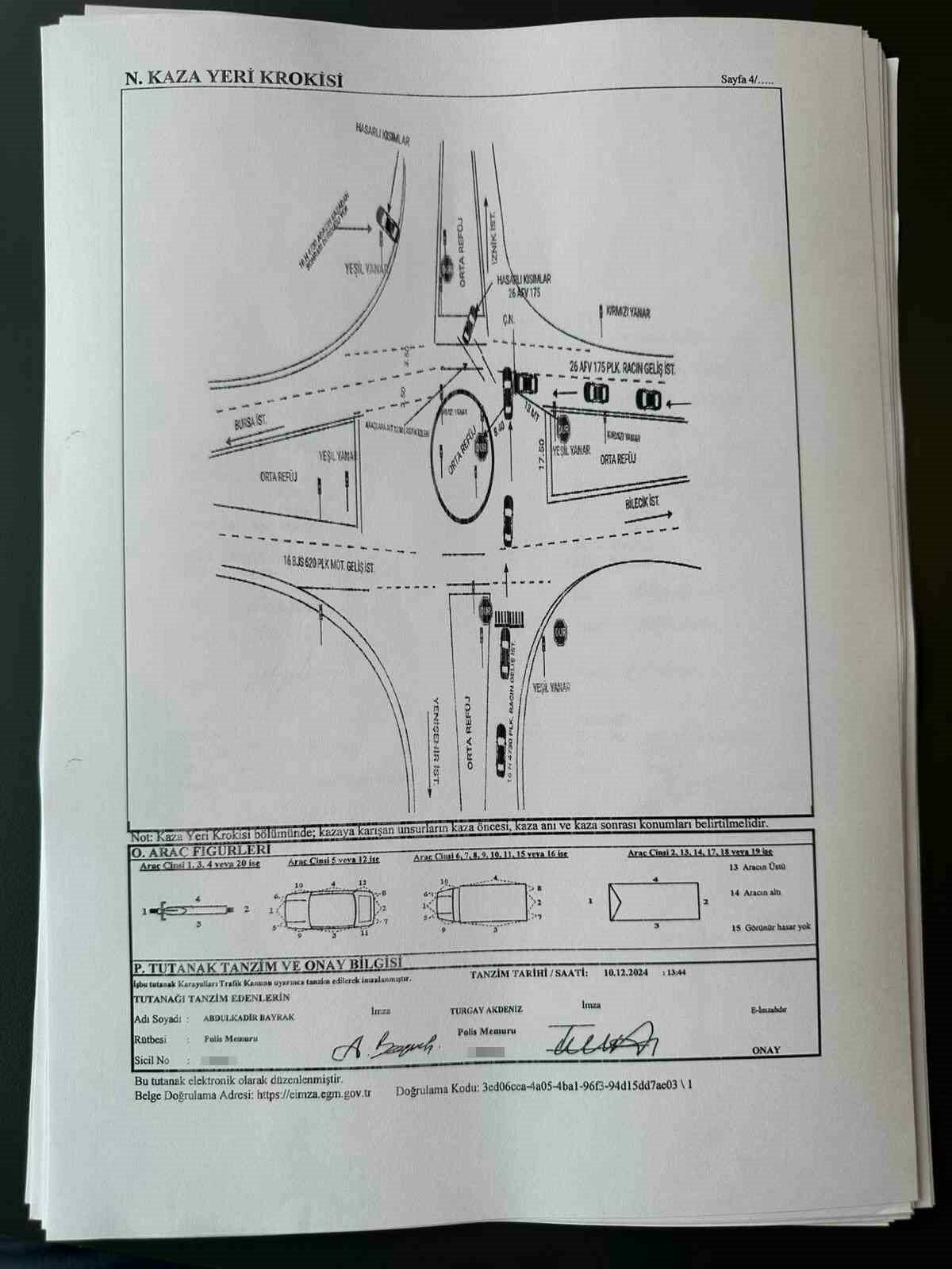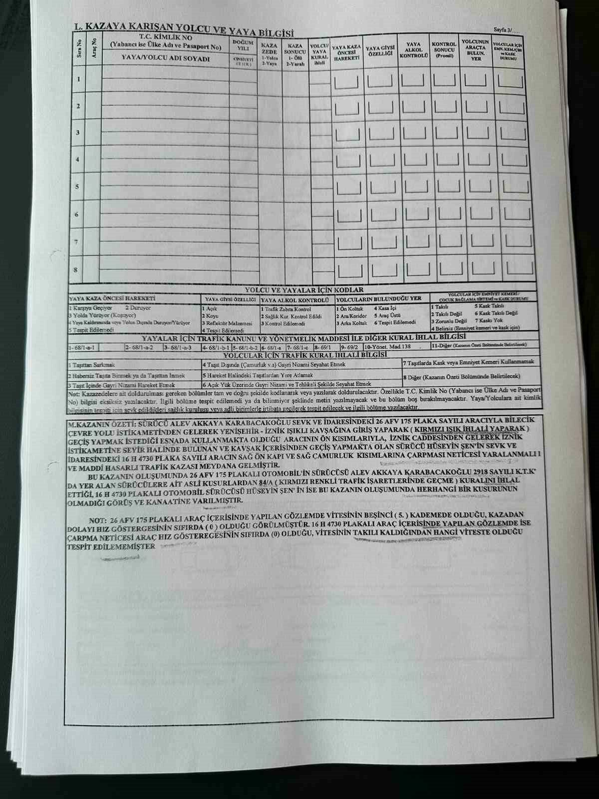 Kaza sonrası polis ekiplerinin tutanaklarına sürücü Alev Akkaya Karabacakoğlu’nun “kırmızı ışık ihlali” yaptığı, sürücü Hüseyin Şen’in kusuru bulunmadığı işlendi. Ayrıca sürücü Karabacak’ın kaza esnasında 5’inci viteste seyrettiği ortaya çıktı.