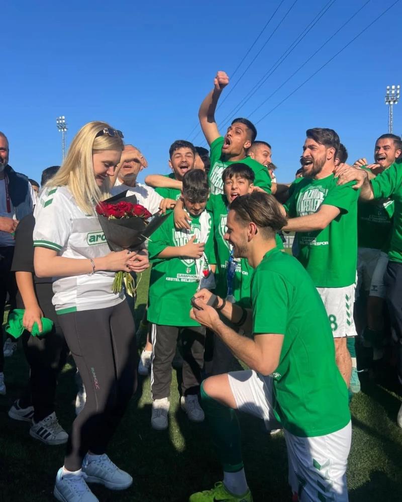 Kestel Belediyespor forması giyen 24 yaşındaki tecrübeli kanat oyuncusu Hafız Görkem Vardar, maçın bitiminde kız arkadaşına sahada evlenme teklifinde bulundu.