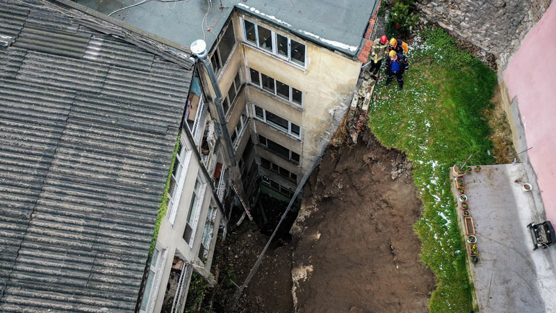 Heyelan nedeniyle binaların arka bahçelerindeki istinat duvarının çöktüğü, toprak yığınlarının ve beton parçalarının apartmanların 3. katına kadar girdiği görüldü.