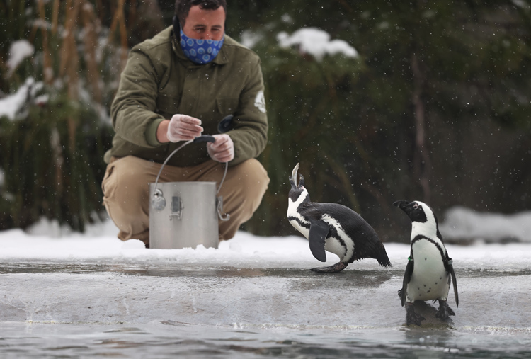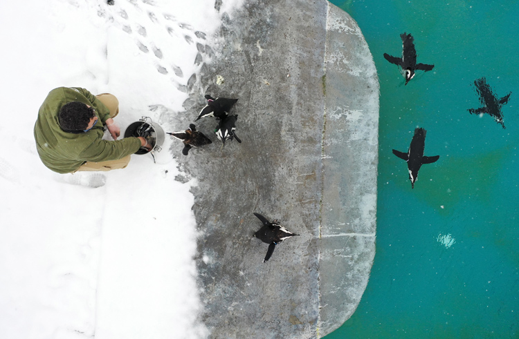 Hayvanat bahçesinde, zor kış koşullarına alışkın olan kaplan ve penguenlerin beslenme saatleri drone ile görüntülendi.