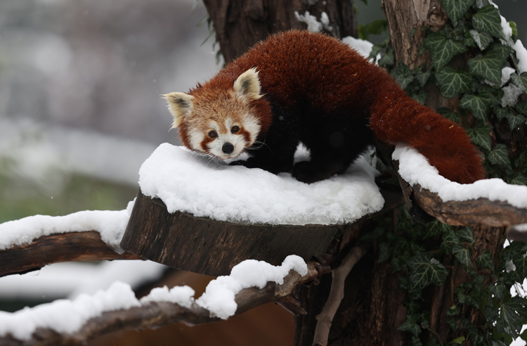 Kış şartlarına dayanıklı olan kırmızı pandalar da yaşam alanlarında karın tadını çıkarıyor.
