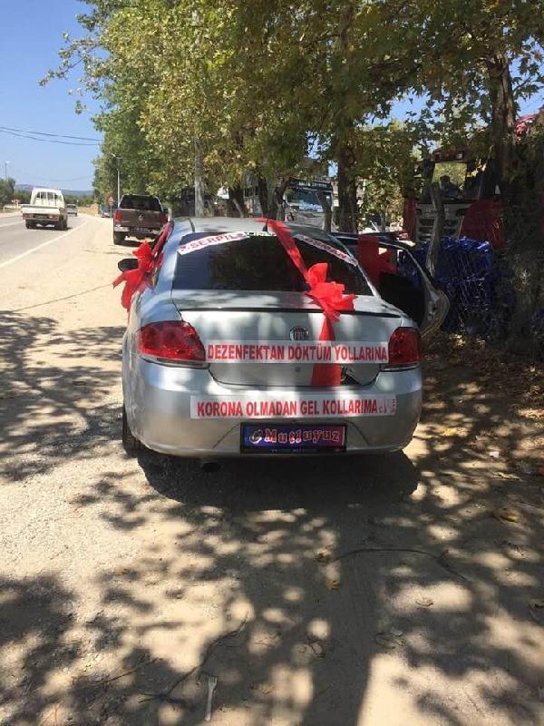 Çift, gelin arabalarının arkasına ‘Dezenfektan döktüm yollarına, korona olmadan gel kollarıma’ yazılı pankart astı.