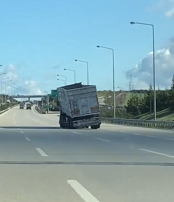 Bursa- İzmir yolunda 61 K 15604 plakalı TIR’ın, 42 AGY 174 plakalı dorsesinin yan yatmış halde trafikte ilerlediği anlar, bir başka sürücü tarafından cep telefonu kamerasıyla görüntülendi.