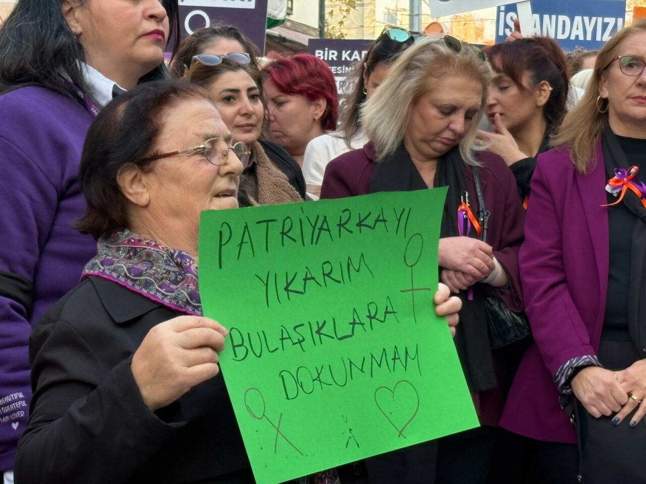 Türkiye’de kadına yönelik şiddetin ulaştığı boyutlara değinen Derya Şimşek Aksakal, 2025’in ilk on ayında 408 kadının öldürüldüğünü hatırlatarak, “Bu cinayetler ‘özel alan’ meselesi değildir, ‘öfke patlaması’ değildir, ‘kader’ değildir. Bu cinayetler politiktir. Çünkü kadınların yaşam hakkını koruyacak yasalar uygulanmadığında kadınlar ölür. Koruma kararları kâğıt üzerinde kaldığında kadınlar ölür. Failler cezasız kaldığında erkek şiddeti güçlenir. Biz biliyoruz ki; 6284 etkin uygulanırsa kadınlar yaşar” dedi. Aksakal, ekonomik kriz, güvencesiz çalışma koşulları, çocuk işçiliği ve yoksulluğun kadınların yaşam hakkını tehdit ettiğini belirterek, “Aile yılı ilan edilen 2025’te her gün en az üç kadın öldürüldü.” dedi.