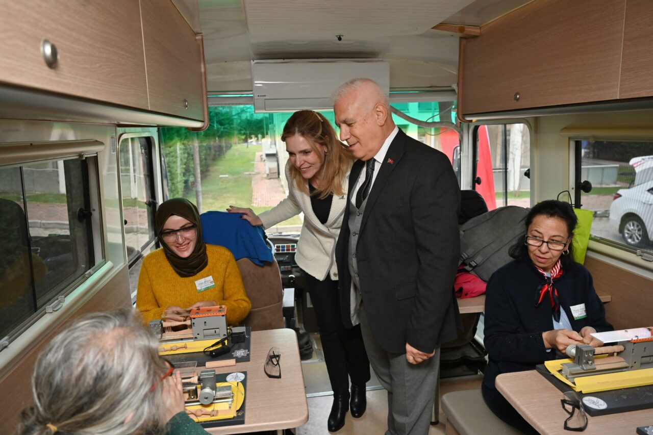 Bursa Büyükşehir Belediyesi Sağlık İşleri Dairesi Başkanlığı Aile, Kadın ve Çocuk Hizmetleri Şube Müdürlüğü ve Kadın Danışma Merkezi işbirliğinde ‘25 Kasım Kadına Yönelik Şiddete Karşı Uluslararası Mücadele Günü’ kapsamında çeşitli atölye çalışmaları düzenlendi. Aile, Kadın ve Çocuk Hizmetleri Şube Müdürlüğü yerleşkesindeki etkinliğe, Bursa Büyükşehir Belediye Başkanı Mustafa Bozbey ve eşi Seden Bozbey’in yanı sıra Dış İlişkiler Dairesi Başkanı Pınar Işıkyıldız ve vatandaşlar katılım gösterdi. Psikolojik dayanıklılık atölyesi, düğme dikimi ve kumaş tamiri atölyesi, ahşap atölyesi ve araç bakımı, lastik değişimi atölyelerini gezerek bilgi alan Başkan Mustafa Bozbey, dikim atölyesinde ise düğme dikti.