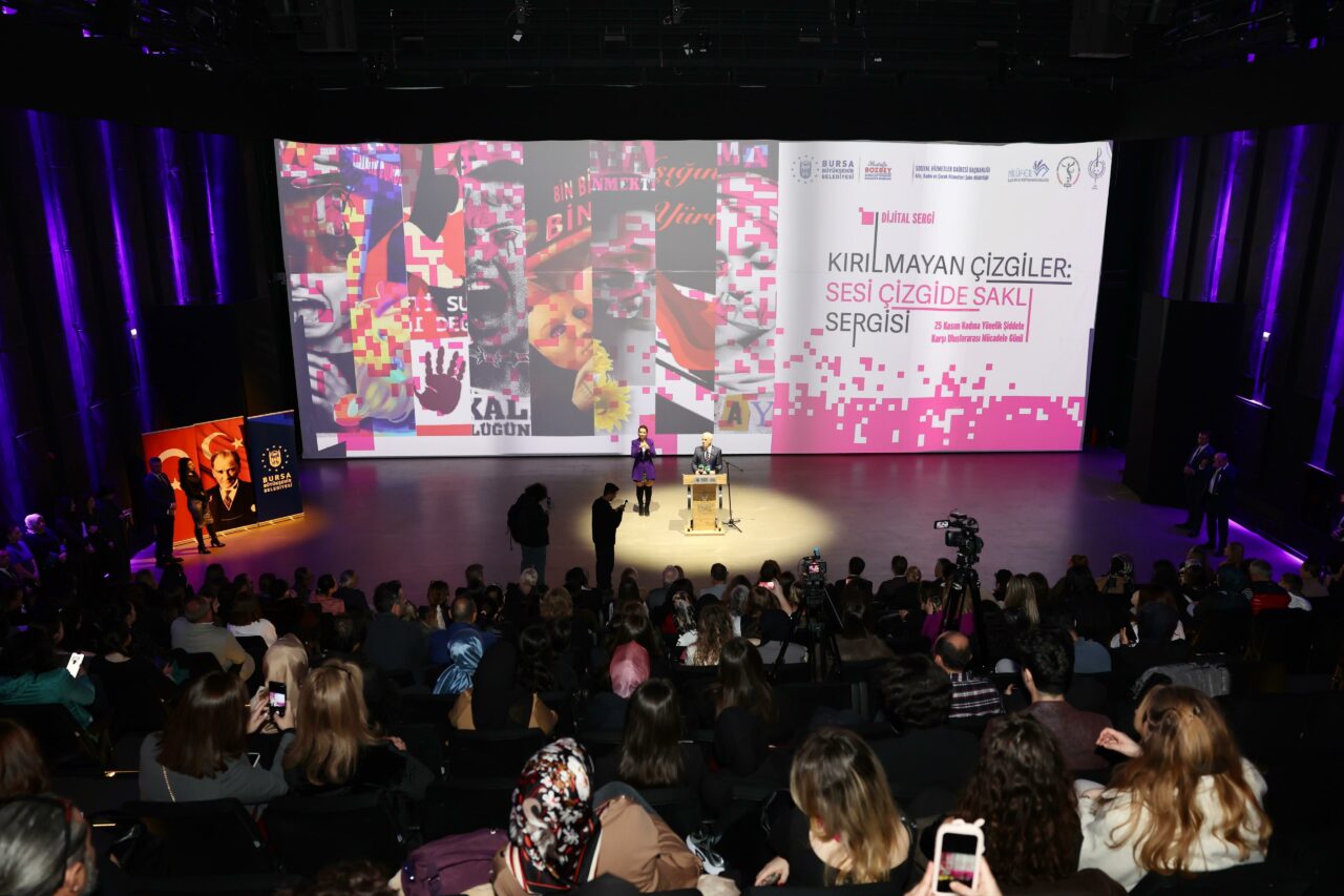 Açılış programında konuşan Büyükşehir Belediye Başkanı Mustafa Bozbey, gençlerin aklından ve hayal gücünden yükselen güçlü farkındalık çağrısını hep birlikte görünür kılmak istediklerini söyledi. Hayata geçirilen dijital serginin dijital alanlarda yaşanan şiddeti, eşitsizlikleri ve görünmeyen yaraları sanatın diliyle ortaya koyduğunu vurgulayan Başkan Mustafa Bozbey, “Sergide yer alan her çizgi, her renk ve her ışık; ‘şiddetsiz bir yaşam mümkündür’ diyen güçlü bir dayanışmanın ifadesidir. Kadına Yönelik Şiddete Karşı Uluslararası Mücadele Günü’nde hayata geçirdiğimiz proje, bu alanda verilen küresel mücadelenin Bursa’daki yansımasıdır. Aynı zamanda Birleşmiş Milletler Kadın Birimi’nin bu yıl belirlediği ‘Tüm kadınlara ve kız çocuklarına yönelik dijital şiddete son verin–Birleşelim’ temasının da önemli bir parçasıdır. Sergi, küresel bir çağrının gençlerimizin üretimiyle yerelde karşılık bulması açısından çok değerlidir” dedi.