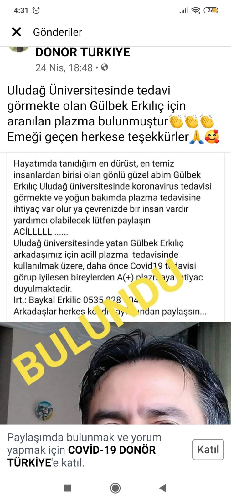 Gülbek Erkılıç için aranan plazma 20 gün sonra 24 nisan tarihinde bulundu. Ancak Erkılıç tedaviye cevap vermeyip dün hayatını kaybetti. Uludağ Üniversitesini yasa boğan haberi Uludağ Üniversitesi Rektörü Prof. Dr. Ahmet Saim Kılavuz sosyal medya hesabından duyurarak “Üniversitemizin sevilen personellerinden, kıymetli kardeşimiz Gülbek Erkılıç’ı Covid-19 hastalığı nedeniyle kaybetmiş olmanın derin üzüntüsünü yaşıyoruz. Mesai arkadaşımıza Allah’tan rahmet, ailesine ve tüm sevenlerine sabırlar diliyorum. Hepimizin başı sağolsun. Mekanı cennet olsun.” paylaşımıyla verdi.